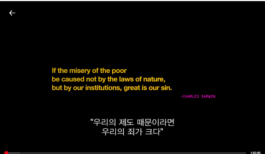다윈의 말이 모두에 나온다. 제도때문에 가난한 사람들이 불행한 것이라면 그건 우리(아마도 제도를 만들고 수행하는 사람들이겠지)의 죄라는 말이 나오고, 이건 자연선택설에 의한 것은 어찌보면 우리가 어쩔 수 없는 것이라는 말의 방증 같기도 하다.